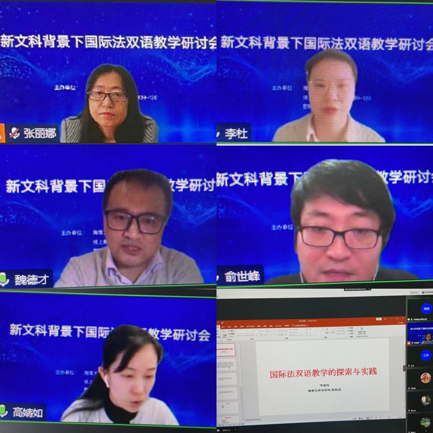 研讨会上,邓和军副院长指出,在新文科建设背景下,国际法双语教学改革具有重要意义,其能对促进国际法双语教学规范化、提升国际法双语教学质效、培养海南自贸港高水平涉外法治人才提供重要支撑。上海交通大学402永利集团官网入口薛桂芳教授、中南财经政法大学402永利集团官网入口江河教授、吉林大学402永利集团官网入口姚莹教授结合自身双语教学经验,分别就《海洋法》双语教学的模式与方法、国际法双语教学的困境和经验、国际法双语教学体验式模拟法庭教学等做了主旨演讲。402cc永利集团402永利集团官网入口张良福教授、魏德才副教授、何海榕副教授、李杜副教授、俞世峰副研究员、高婧如讲师、张红宽讲师、纪韶昱讲师、段文讲师等针对国际公法、国际经济法、国际私法、国际法英文模拟法庭等主题做了发言。402cc永利集团402永利集团官网入口赵永琛教授做会议总结发言,他强调我国在全球治理体系中的国际影响力不断提高,需要大批通晓国际规则、精通外语的涉外法治人才队伍,开展双语教学是涉外法治人才培养的重要手段。