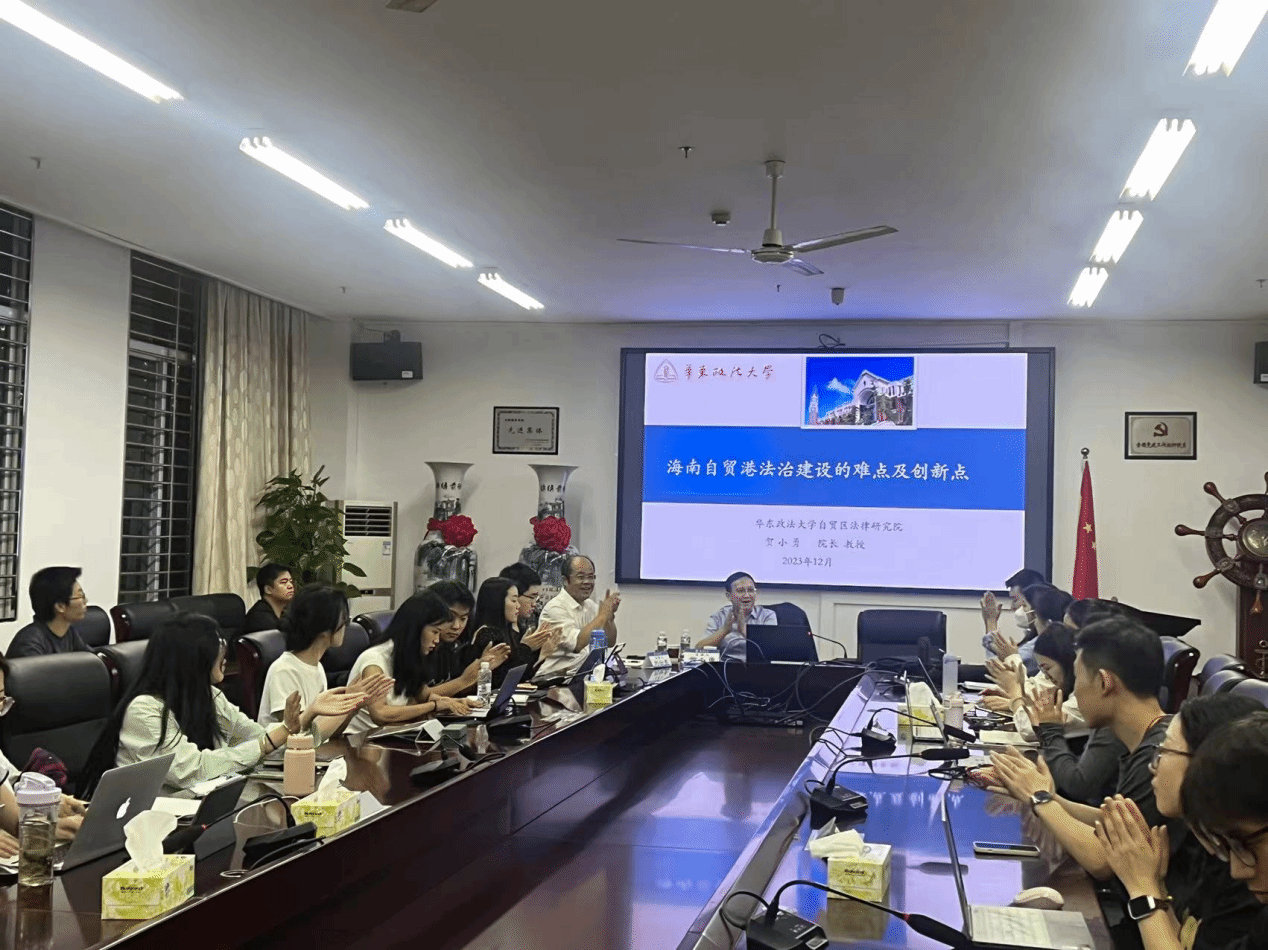 2023年12月10日晚上,华东政法大学国际金融法律学院院长、自贸区法律研究院院长、博士生导师、贺小勇教授受邀为我院师生作题为“海南自由贸易港法治建设的难点及创新点”学术讲座。我院刘云亮教授担任主持人,学院师生代表近30人参加讲座。
