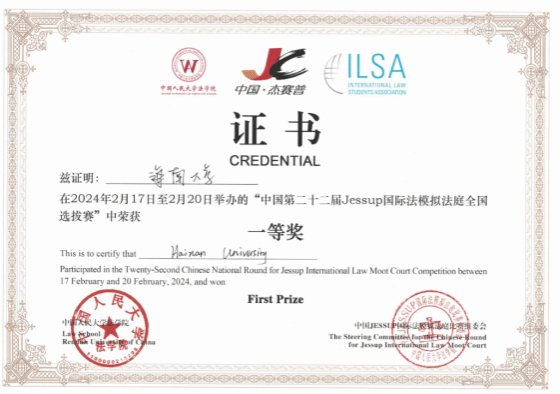 2024年2月17日至20日,第65届“杰赛普”国际法模拟法庭竞赛(Philip C. Jessup International Law Moot Court Competition)暨中国第二十二届“杰赛普”全国选拔赛在北京市中国人民大学明德楼举行。经过激烈角逐,我校代表队在65支参赛队伍中脱颖而出,挺进了本届竞赛的十六强淘汰赛,积分位列第十二名。最终荣获全国选拔赛一等奖,这是我校参加该项竞赛历史上的最好成绩。