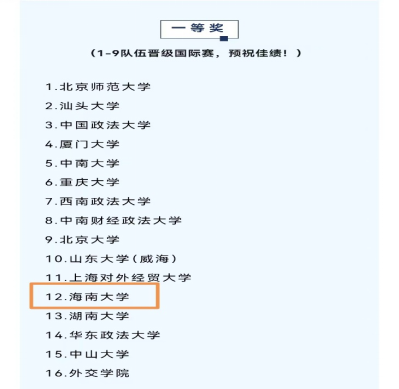 (图一 本届Jessup竞赛获奖证书以及一等奖获奖院校名单)