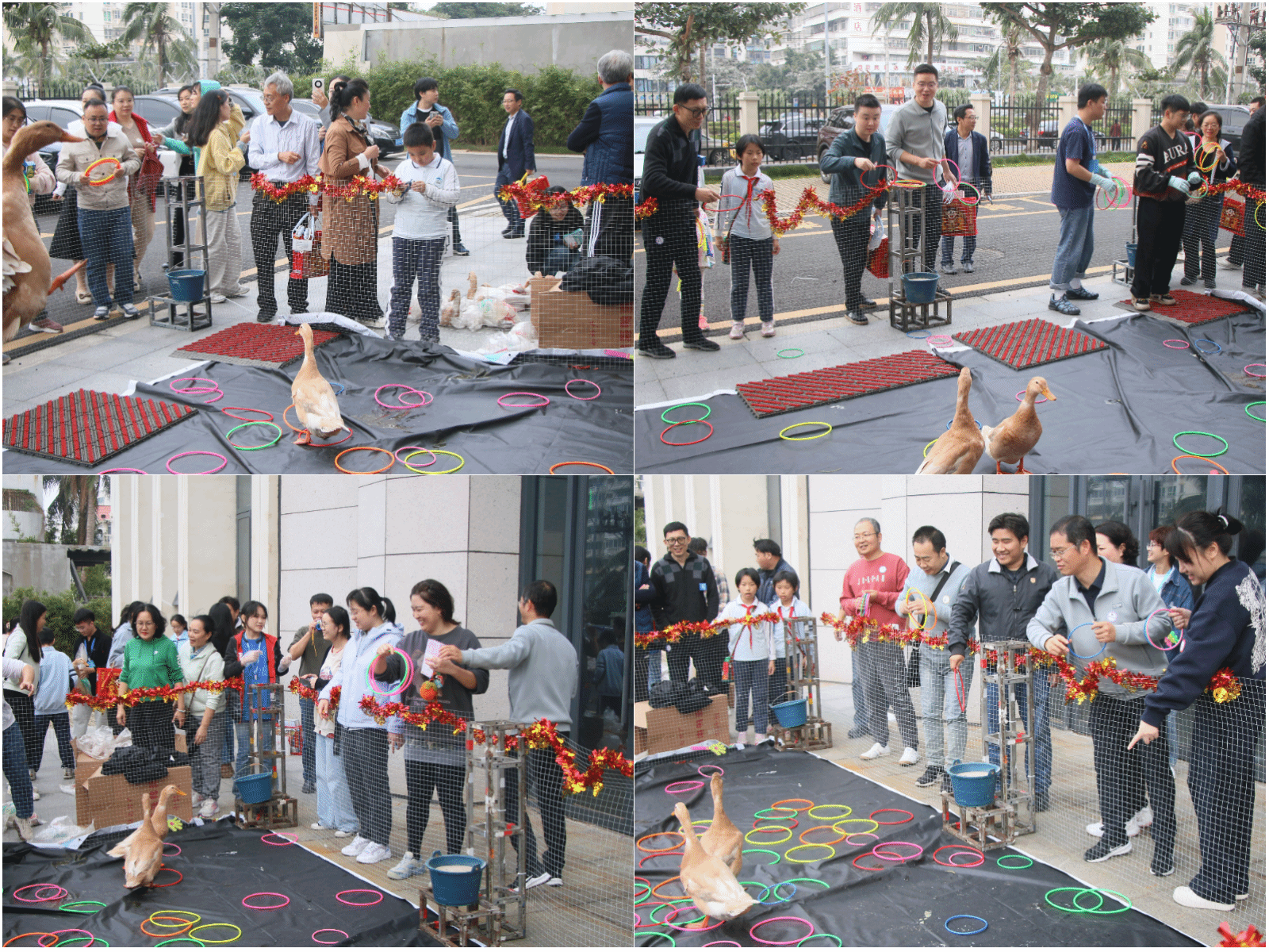在“蛇环套鸭”活动中,参与者若用套圈套住鸭子的脖子,就有机会将可爱鸭子带回家。只见大家屏气凝神,瞄准目标,扔出套圈,各自使出看家本领,各展神通,套鸭活动不仅考验了参与者的技巧与耐心,还增加了竞争的乐趣。