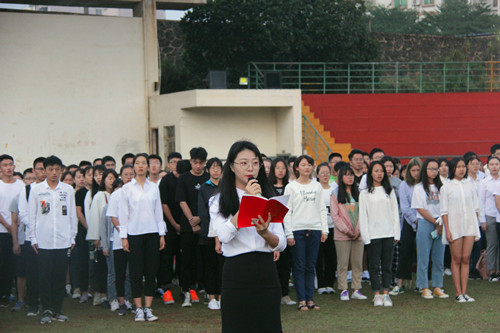 第二项,由学生代表2018级法学1班李雨桐同学带领全体同学面对着国旗诵读宪法。在激昂的诵读声中,全体法科学子表达了“忠于宪法、遵守宪法、维护宪法”的坚定信念。