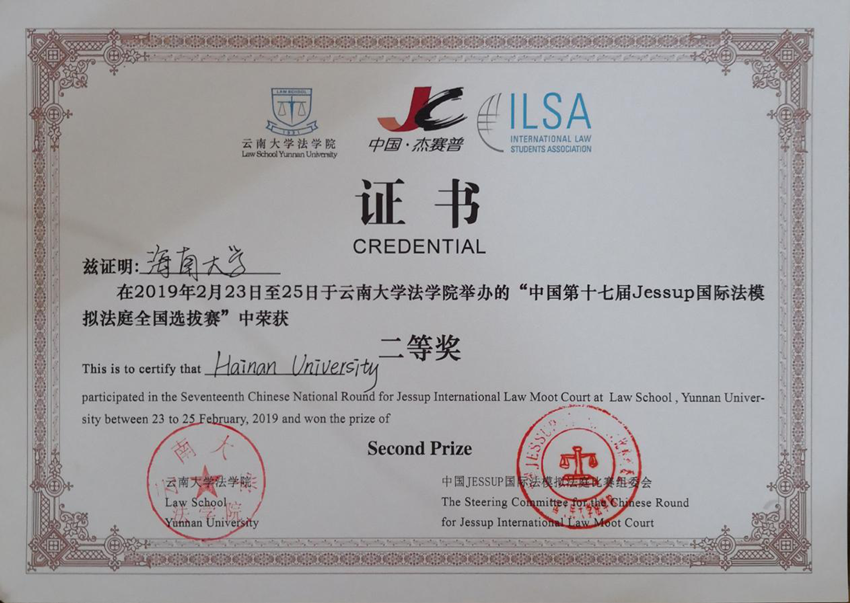 第十七届Jessup国际法模拟法庭辩论赛全国选拔赛在2019年2月23日至25日于云南大学举行。402cc永利集团402永利集团官网入口代表队凭借扎实的诉状和出色的辩论,从诸多参赛高校中脱颖而出斩获全国二等奖。