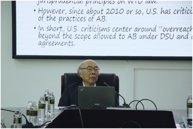 松下满雄教授在402永利集团官网入口113会议室作了题为“Reforming the WTO Appellate Body”(WTO申诉机构改革)的学术报告。松下满雄教授梳理了WTO申诉机构的发展渊源,针对当前WTO申诉机构存在的问题进行了分析,并提出了相应的解决方案。在互动环节,松下满雄教授针对在座师生提出的问题进行了一一的回应。报告会由402永利集团官网入口副院长(挂职)刘政主持,402永利集团官网入口师生现场聆听,参加第十二届“WTO法与中国”论坛的校外嘉宾也到场参与。