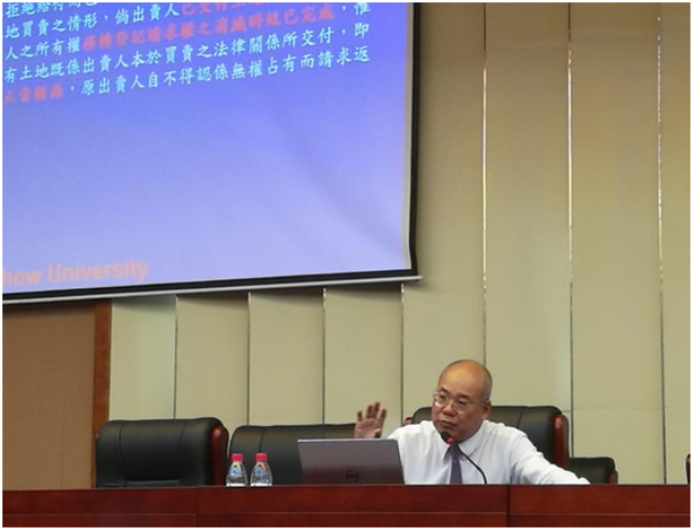 课程分为三个部分:第一天上午,郑冠宇教授就台湾地区《民法》的“占有”部分,从“法律关系”、“不当得利”和“无权处分”三部分进行讲授;当日下午,郑教授就“添附”部分进行讲授,着重于添附的法律关系和法律效果。第二天上午,郑教授对台湾地区的“消灭时效”制度进行讲解。郑冠宇教授讲课深入浅出、风趣幽默,就两岸法规辅以丰富案例进行体系化比较,获得在座同学的一致好评。