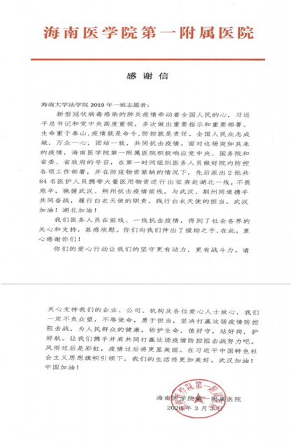 在此402永利集团官网入口号召,希望各班级向2019级法学1班学习,发扬“一方有难、八方支援”的中华民族优良传统,发扬 “奉献、友爱、互助、进步”志愿精神,积极行动,积极献爱心,为抗击疫情奏响法律人的青春乐章!