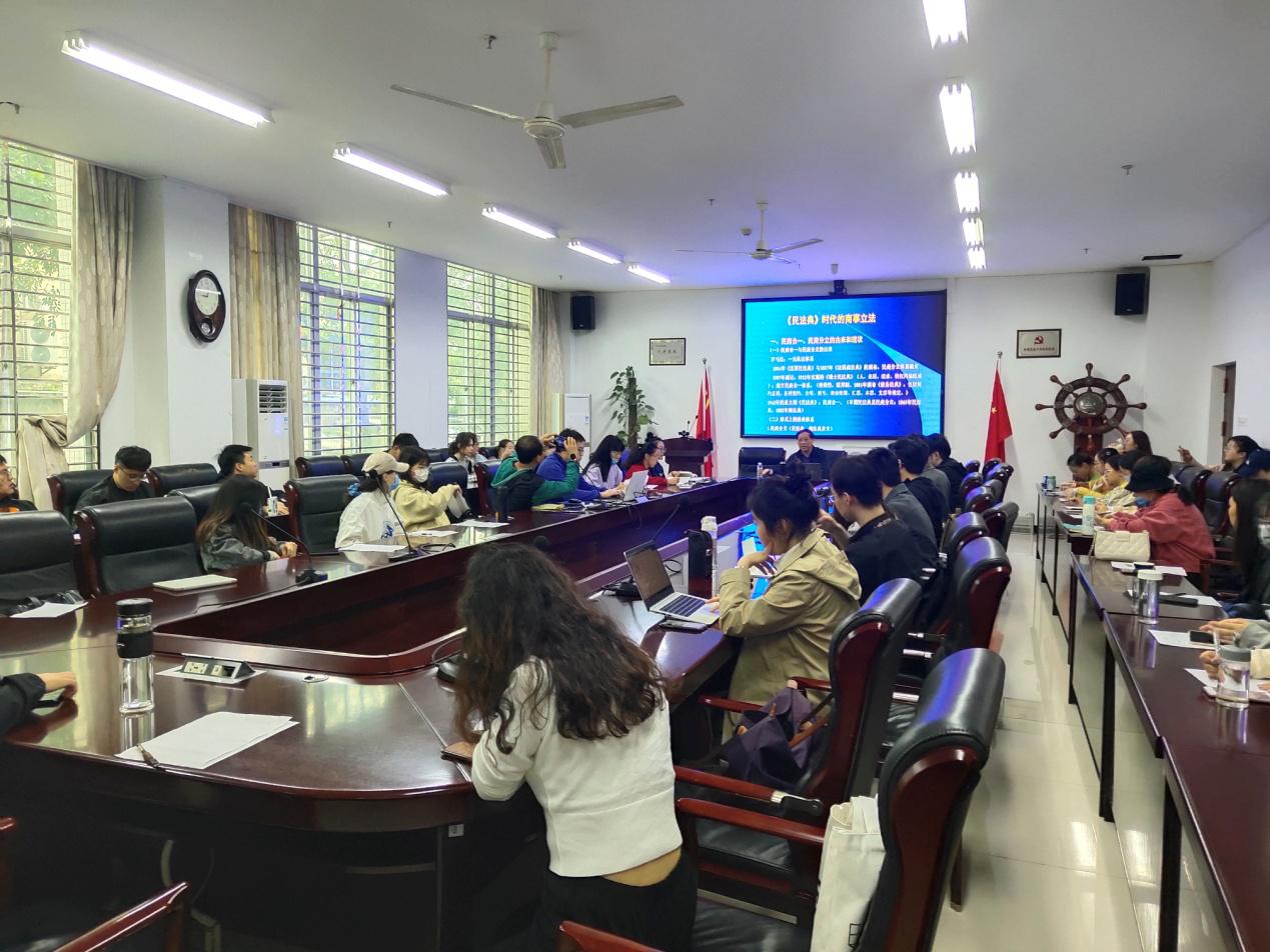 12月4日上午,民法典深度解读系列讲座第6讲”在社科楼C113会议室开讲,402cc永利集团402永利集团官网入口教授、博士生导师彭真明主讲《民法典时代的商事立法》一题,近60名本硕博学生现场聆听讲座。