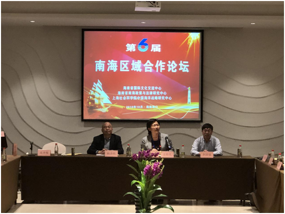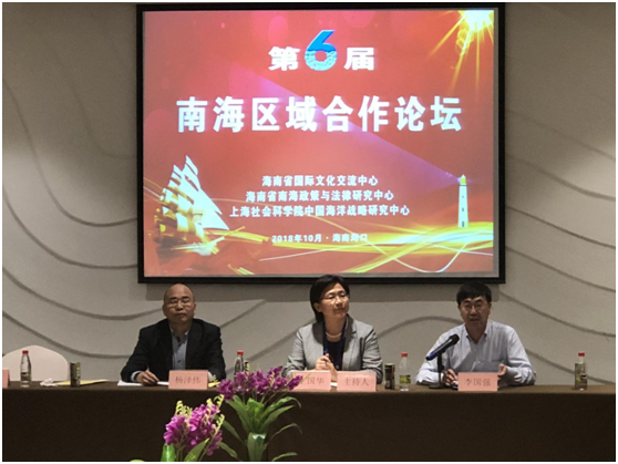 2018年10月20日,由海南省国际文化交流中心、海南省南海政策与法律研究中心和上海社会科学院中国海洋战略研究中心联合举办的“第六届南海区域合作论坛”在海南省澄迈县举行,来自自然资源部、中国社会科学院中国边疆研究所、中国海洋石油集团有限公司、国防大学、武汉大学、中南财经政法大学、大连海事大学、上海海事大学、华东政法大学、英国中央兰开夏大学、香港亚太研究中心、台湾政治大学、台湾师范大学等的40多位专家学者与会。