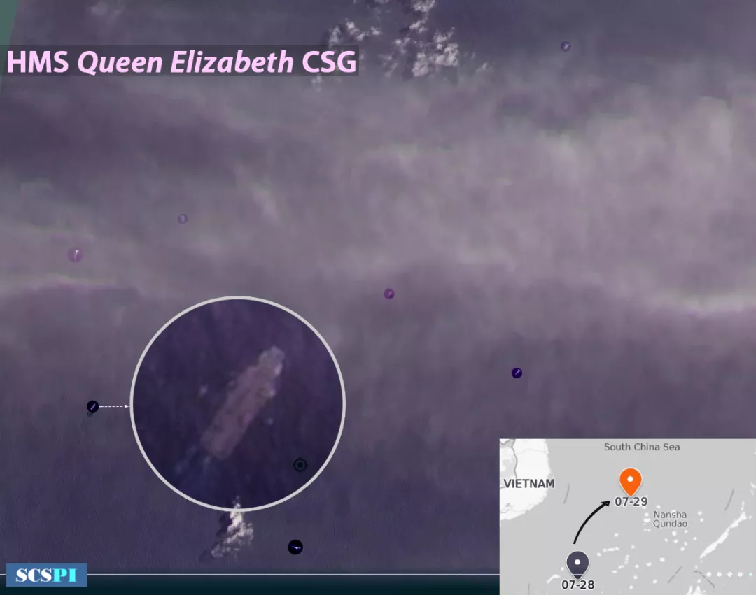 7月29日,英海军“伊丽莎白女王”号航母打击群在南海活动。图:Planet卫星
